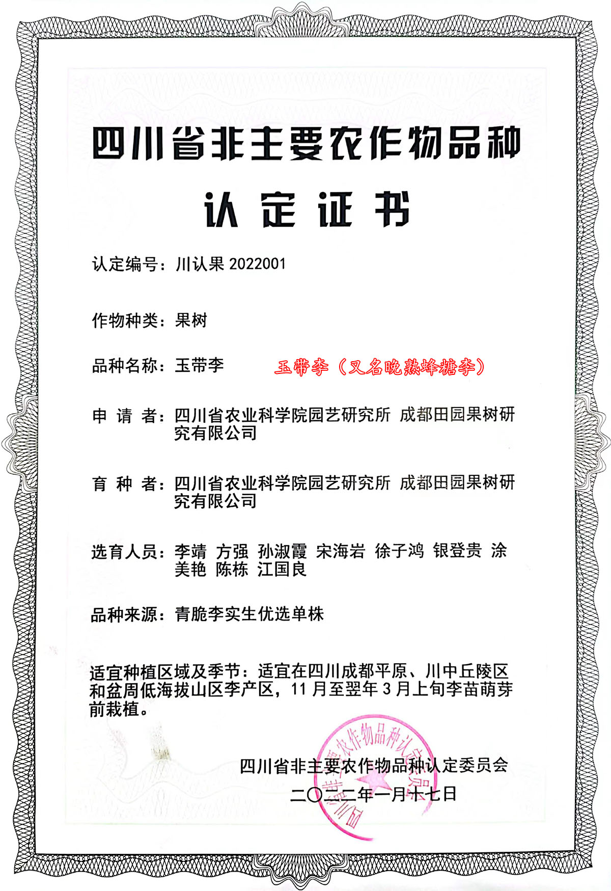 玉帶李認(rèn)定證書