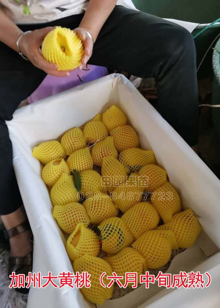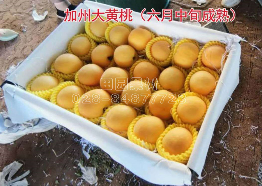加州黃桃(美國):高檔鮮食黃桃品種,果實6月中旬成熟,果個大,產量高,平均單果重245克,大果重450克,硬溶質,果實表面茸毛中等,底色黃,成熟時不套袋多數著深紅色,套袋后外觀金黃,果肉黃色,硬溶質,肉質細,汁液中多,風味濃甜,近核處有紅色素,可溶性固形物含量15%左右,總糖含量13.6%,總酸含品質特優,黏核,花型大,花粉多,自花結實,美國加州黃桃優與國內其它黃桃品種,在中國南北均可栽種,是一個值得發展的新型高檔黃桃新品種。